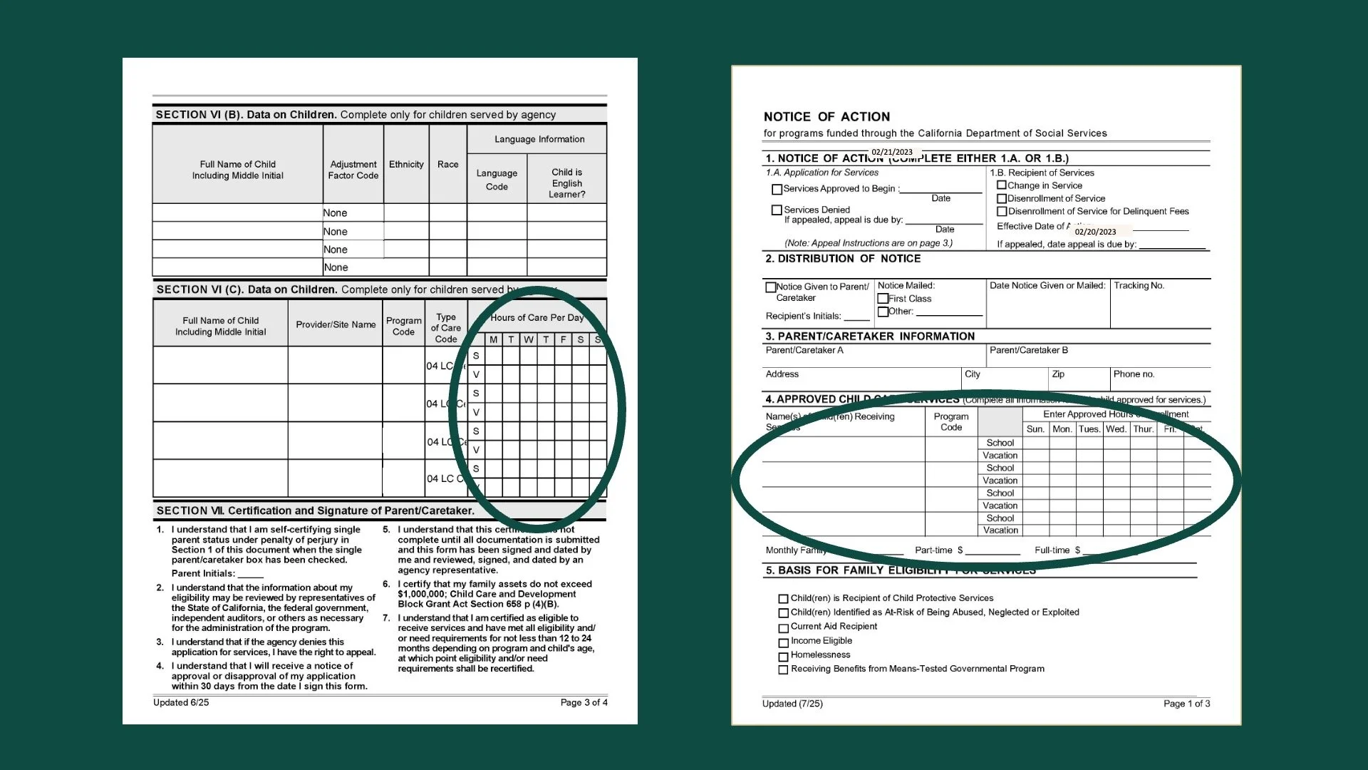 A family’s certified days/hours of care (Documented on the Notice of Action & Application for Services) is determined at the time of certification, recertification or upon parent voluntary request. Once a family establishes eligibility & need, they will remain eligible & receive services for not less than 24 months.