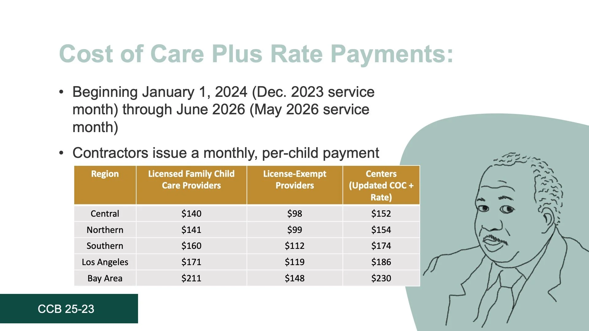 The Department encourages contractors to issue these payments along with their regular subsidy payment to providers and clearly label the Cost of Care Plus Rate payments.