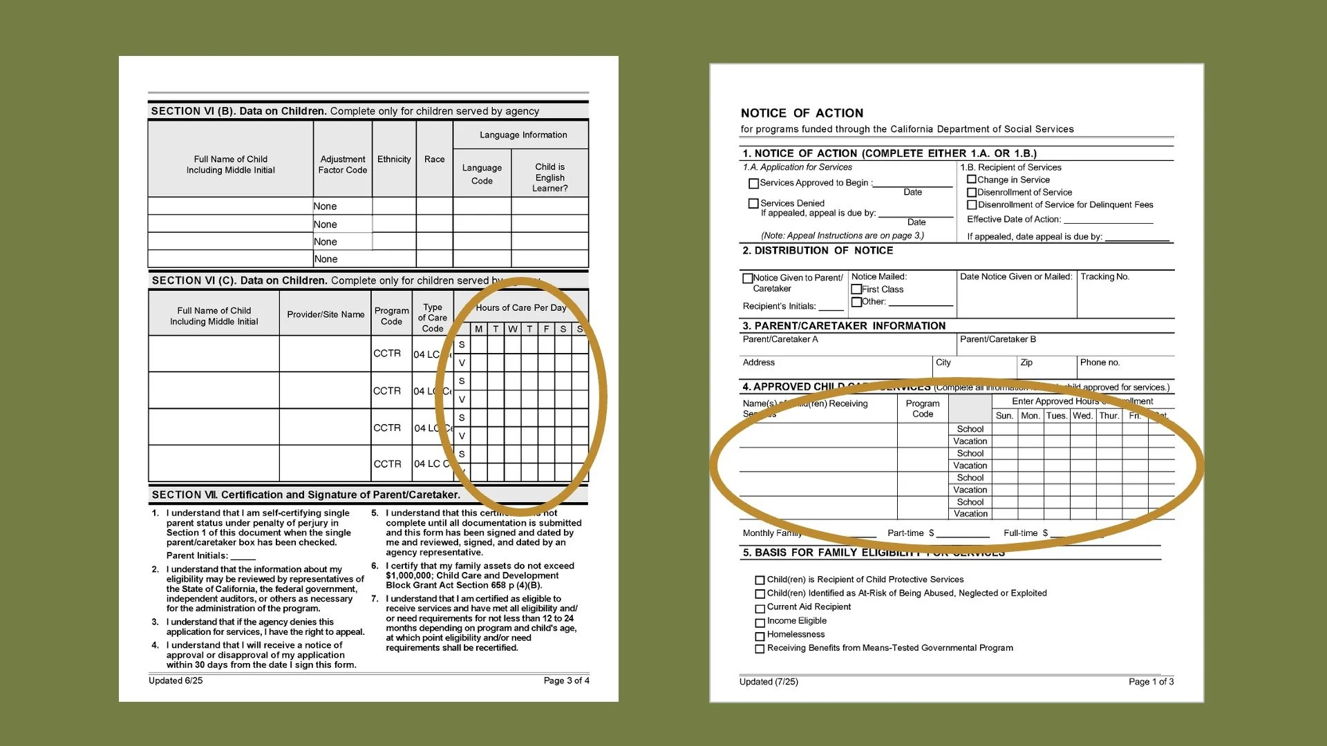 A family’s certified days/hours of care (Documented on the Notice of Action & Application for Services) is determined at the time of certification, recertification or upon parent voluntary request. Once a family establishes eligibility & need, they will remain eligible & receive services for not less than 24 months.