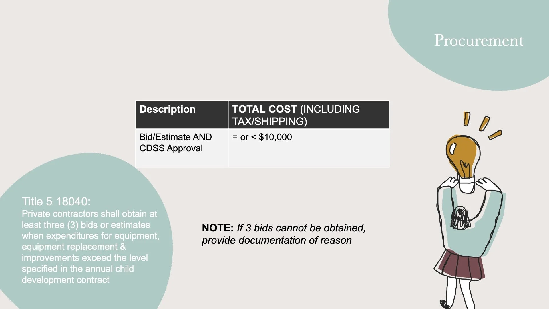 NOTE: Although no formal bidding is required for equipment purchases, replacements and improvements that are less than $10,000, contractors must maintain purchase documentation & justification.