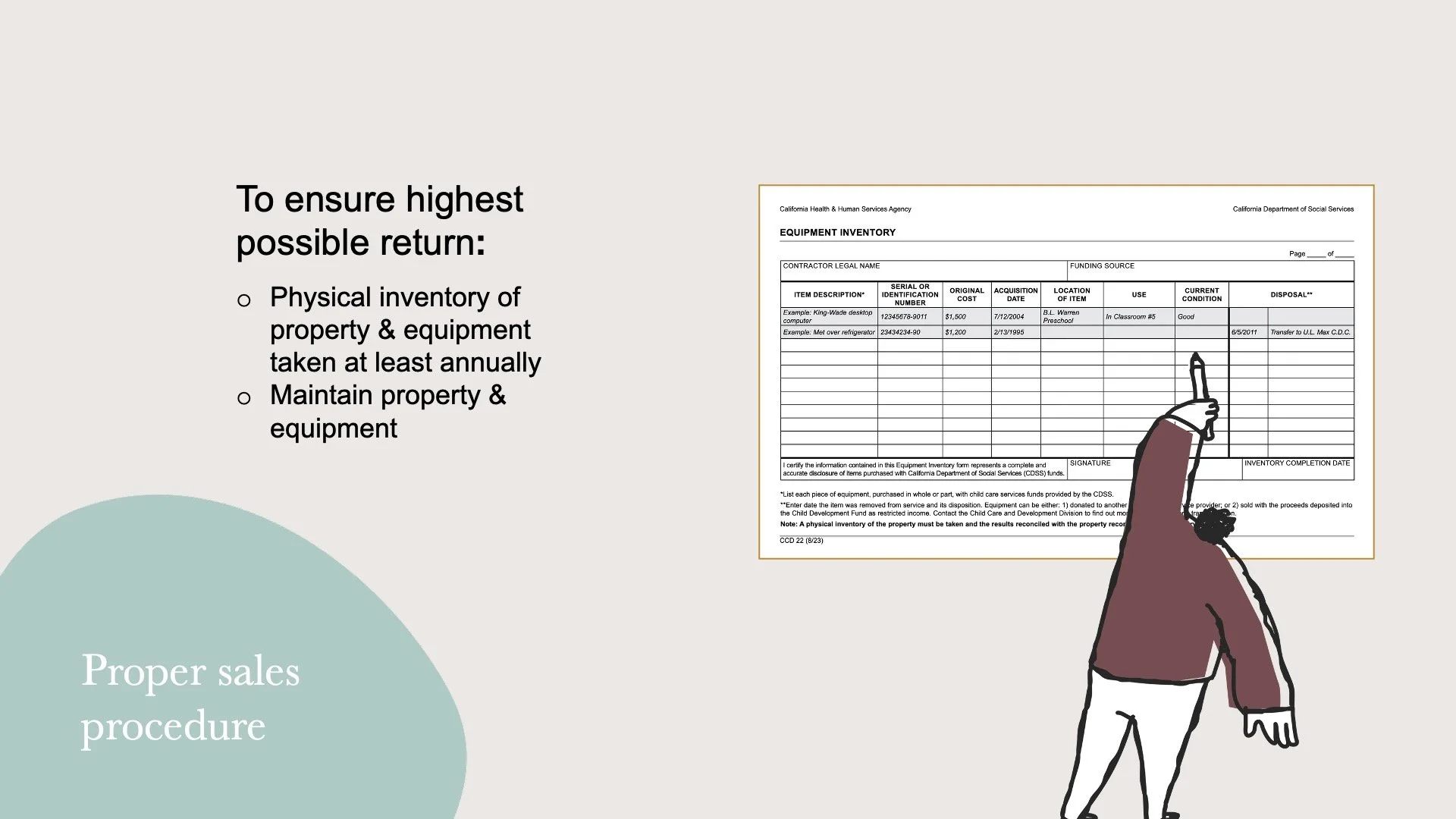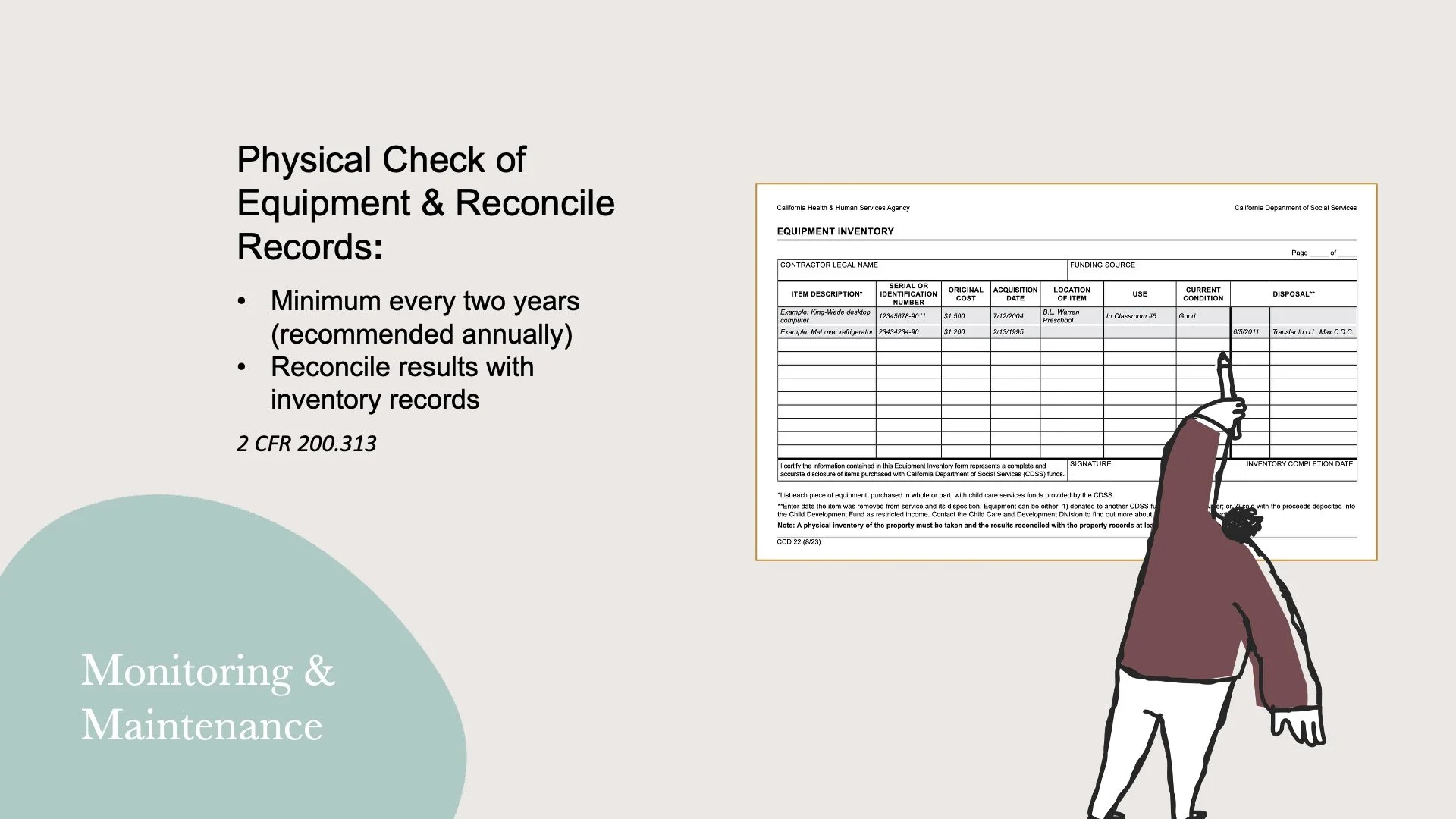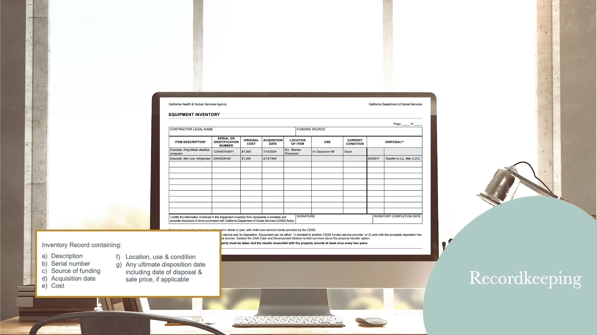 The contractor has adopted procedure for managing equipment, purchased in whole or in part with child care and development contract funds, until disposition of the item. In addition to the requirements above, the contractor has: