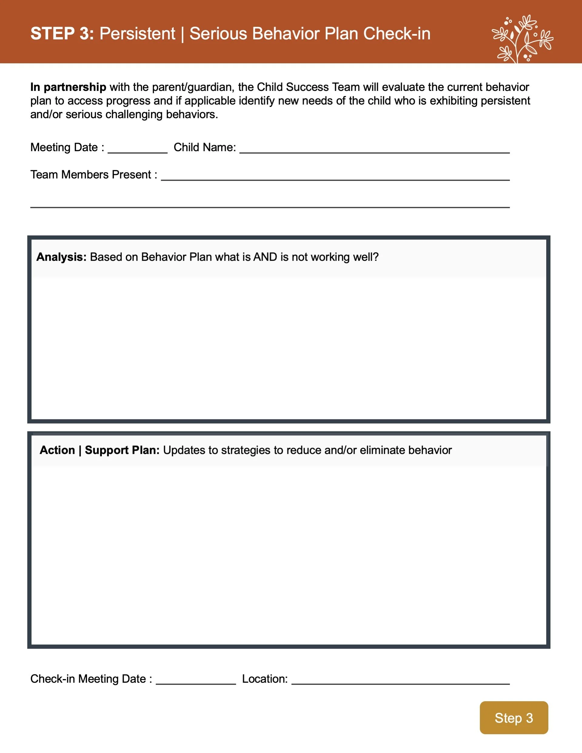 In partnership with the parent/guardian, the Child Success Team will evaluate the current behavior plan to access progress and if applicable identify new needs of the child who is exhibiting persistent and/or serious challenging behaviors.