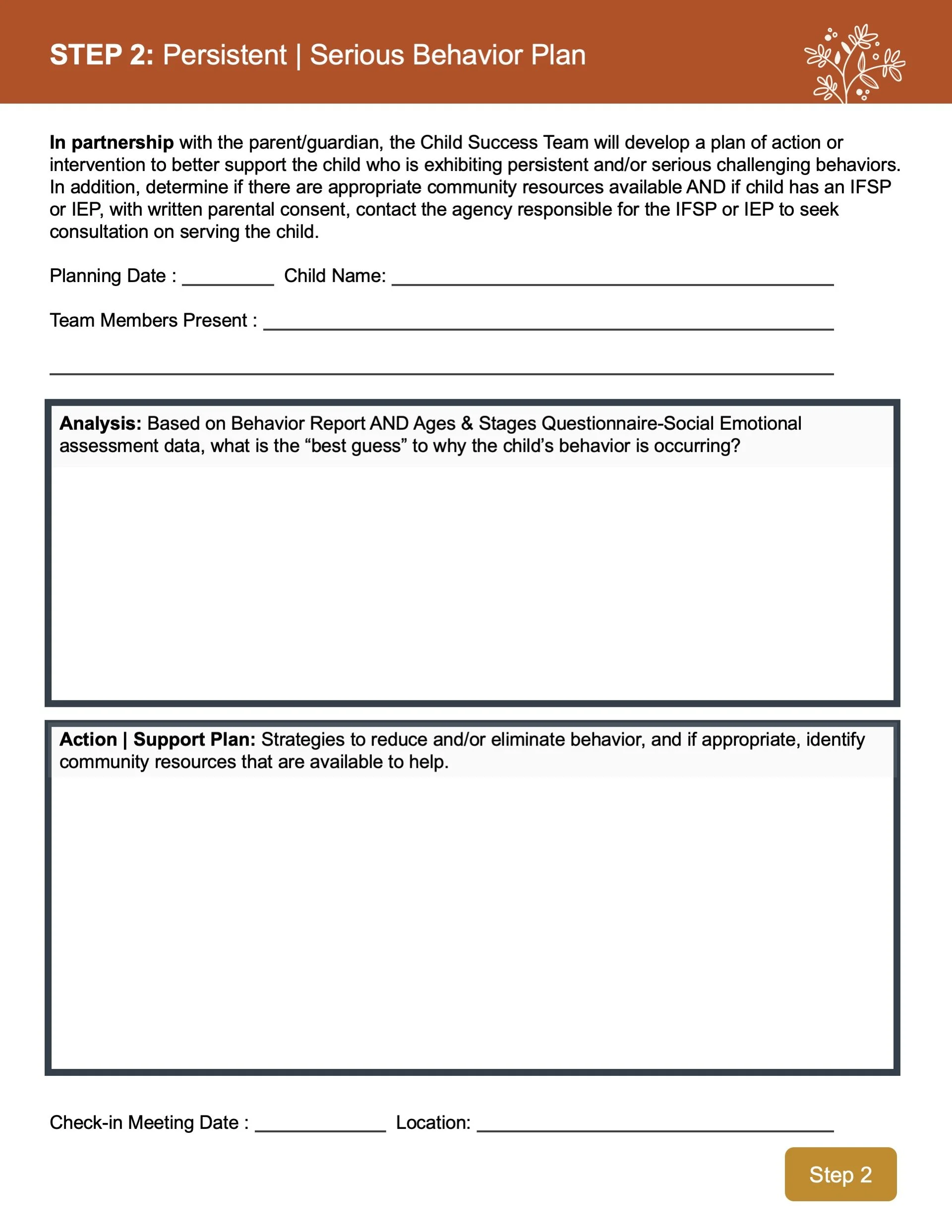 In partnership with the parent/guardian, the Child Success Team will develop a plan of action or intervention to better support the child who is exhibiting persistent and/or serious challenging behaviors, and ensure the safe participation of all children in the program.