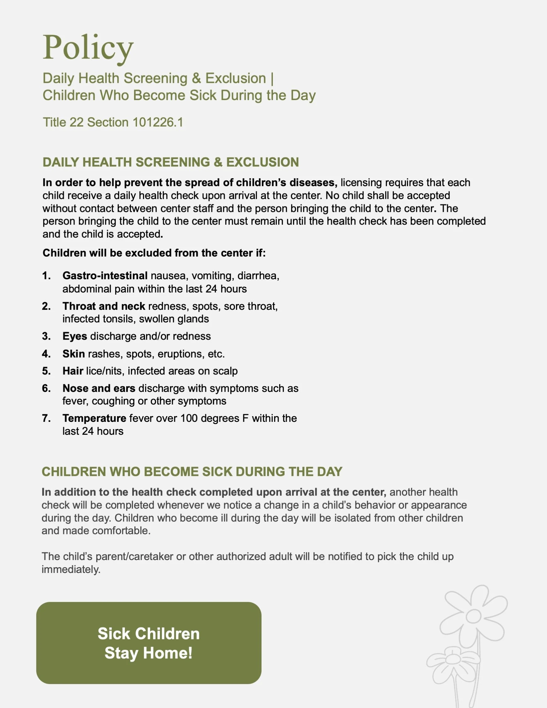 California Department of Social Services Community Care Licensing requires all licensed child care facilities to conduct daily health checks. The check includes ensuring that children with obvious symptoms including, but not limited to, fever or vomiting, are not accepted into care.