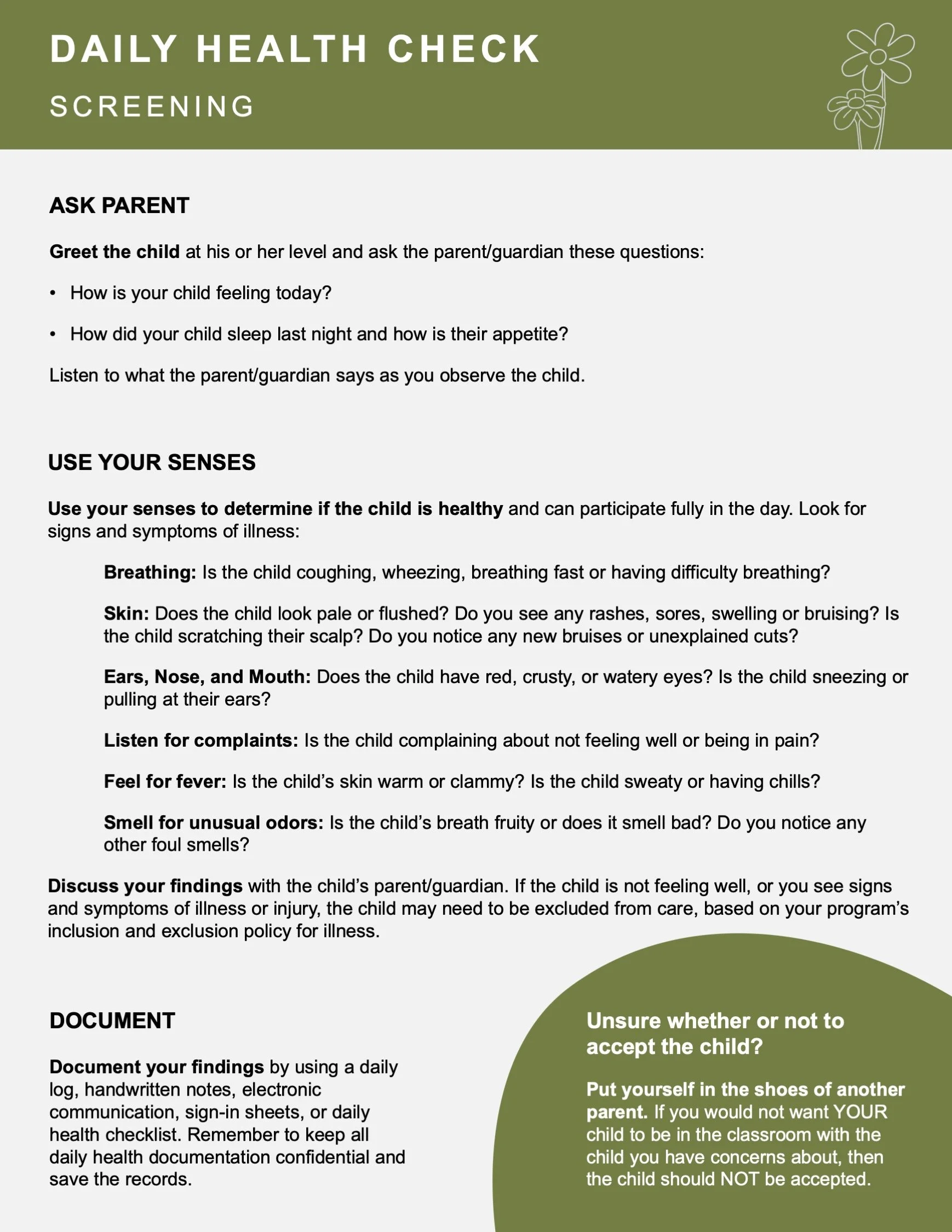 Conduct health checks EVERYDAY in a relaxed and comfortable manner as each child enters the program and before the parent/guardian has left the building.