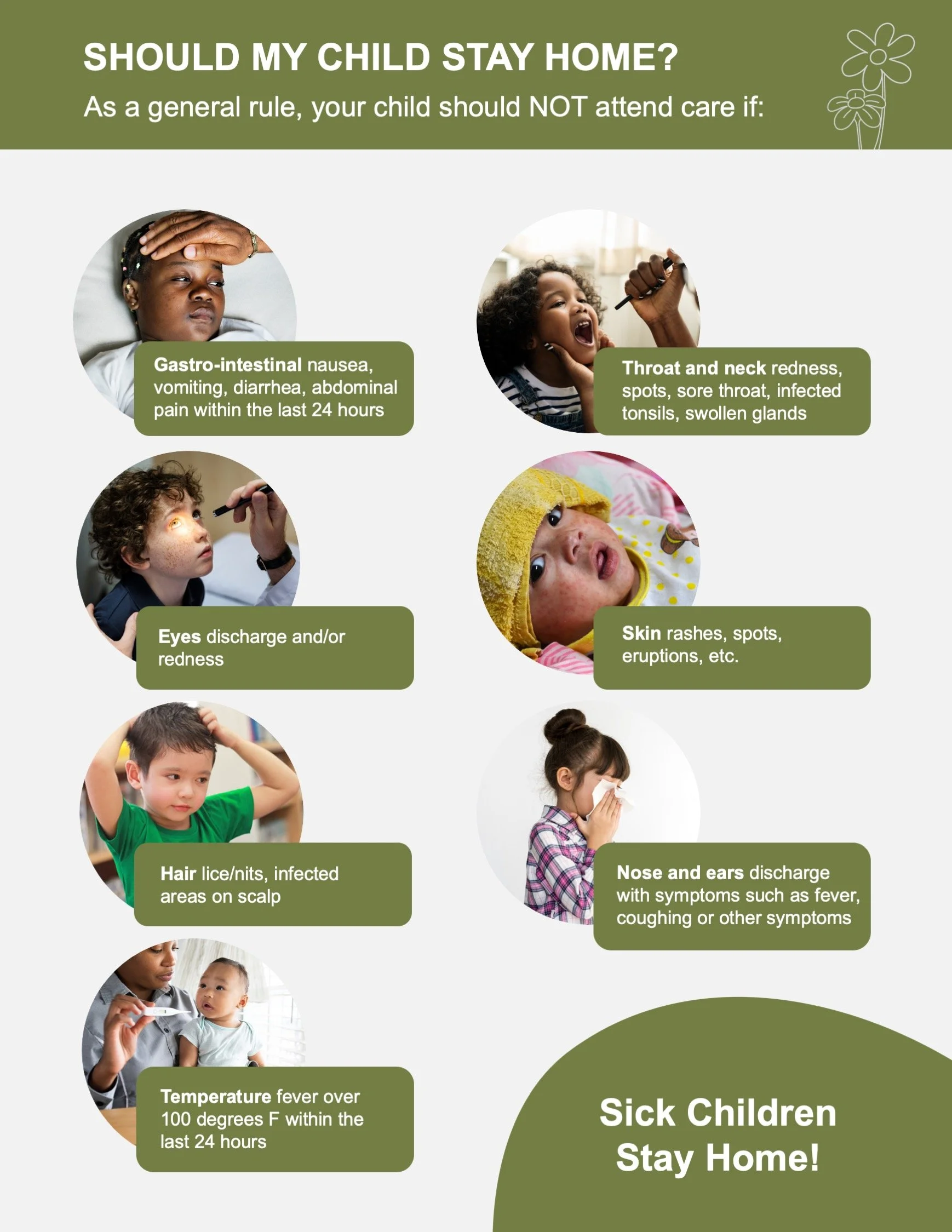 Discuss your findings with the child’s parent/guardian. If the child is not feeling well, or you see signs and symptoms of illness or injury, the child may need to be excluded from care, based on your program’s inclusion and exclusion policy for illness.