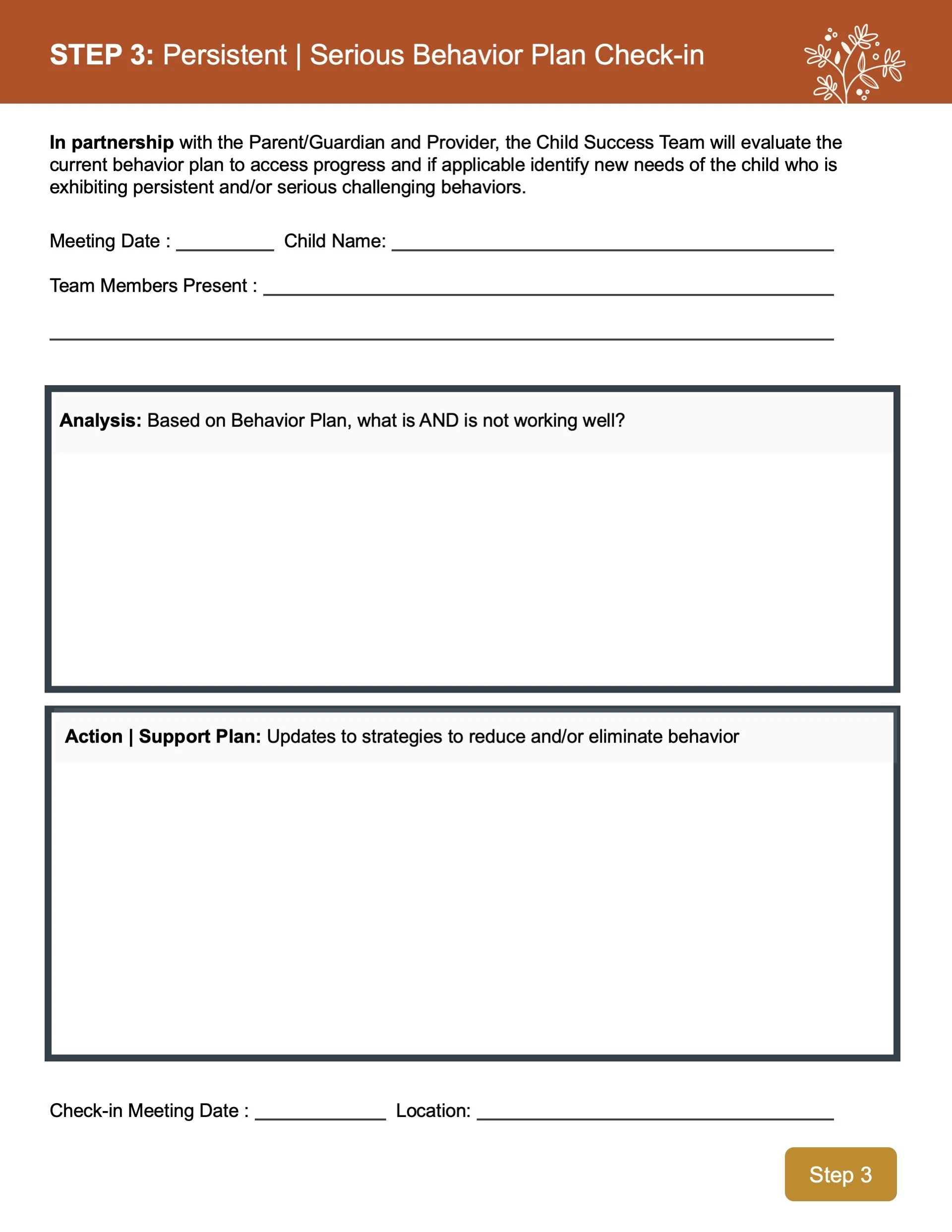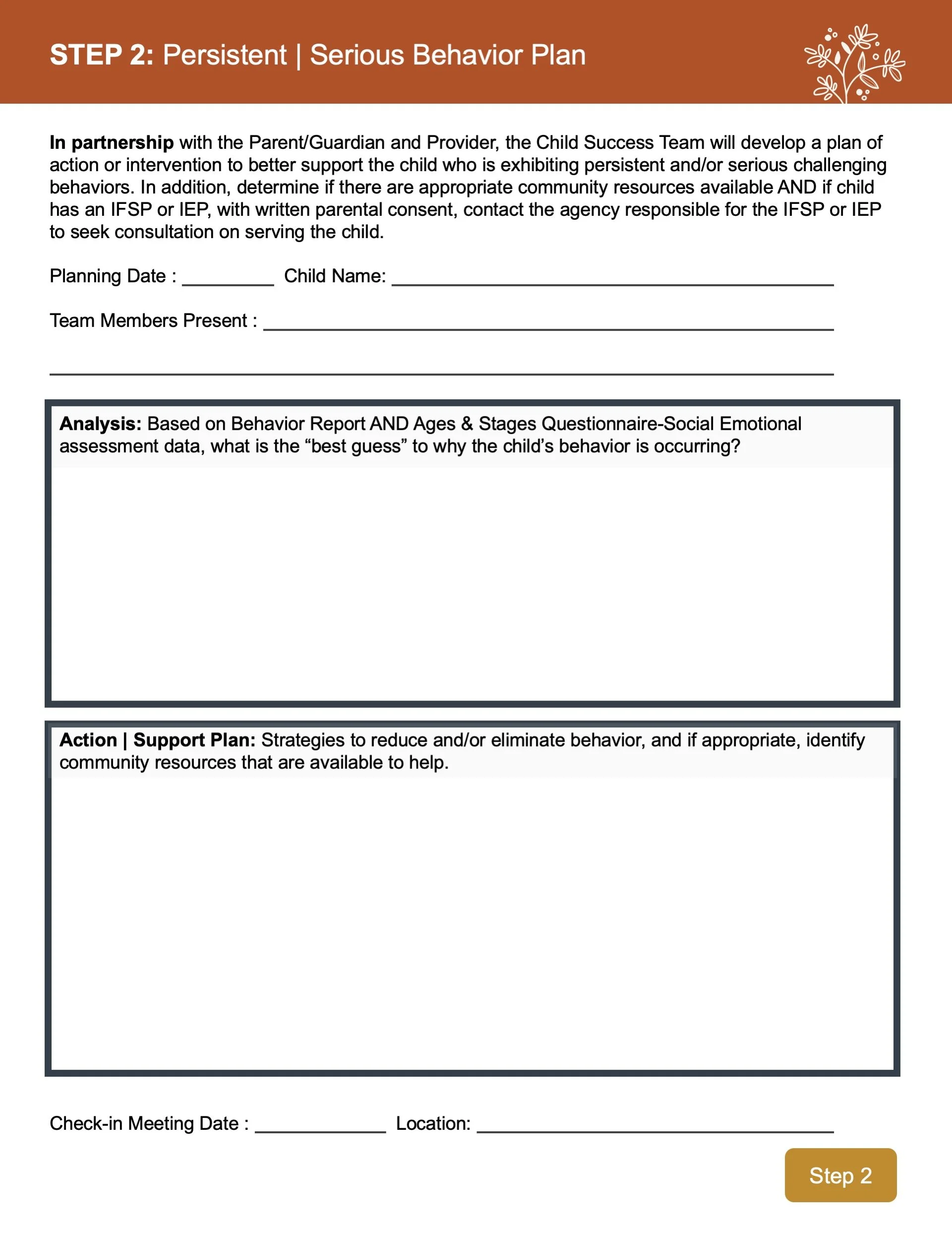 In partnership with the Parent/Guardian and provider, the Child Success Team will develop a plan of action or intervention to better support the child who is exhibiting persistent and/or serious challenging behaviors, and ensure the safe participation of all children in the program.