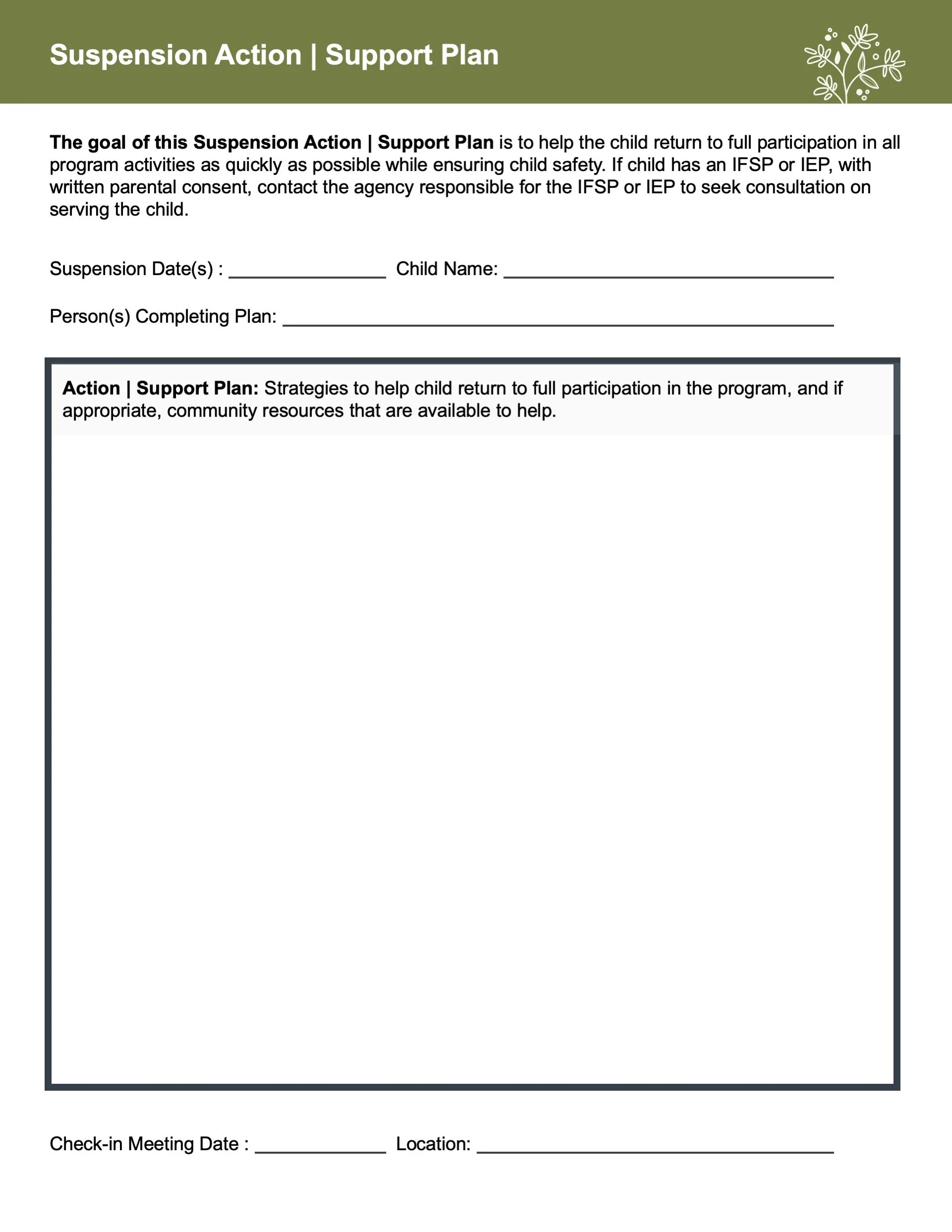 Child Success Team will develop a Suspension Action | Support Plan to help child return to full participation as quickly as possible while ensuring child safety.