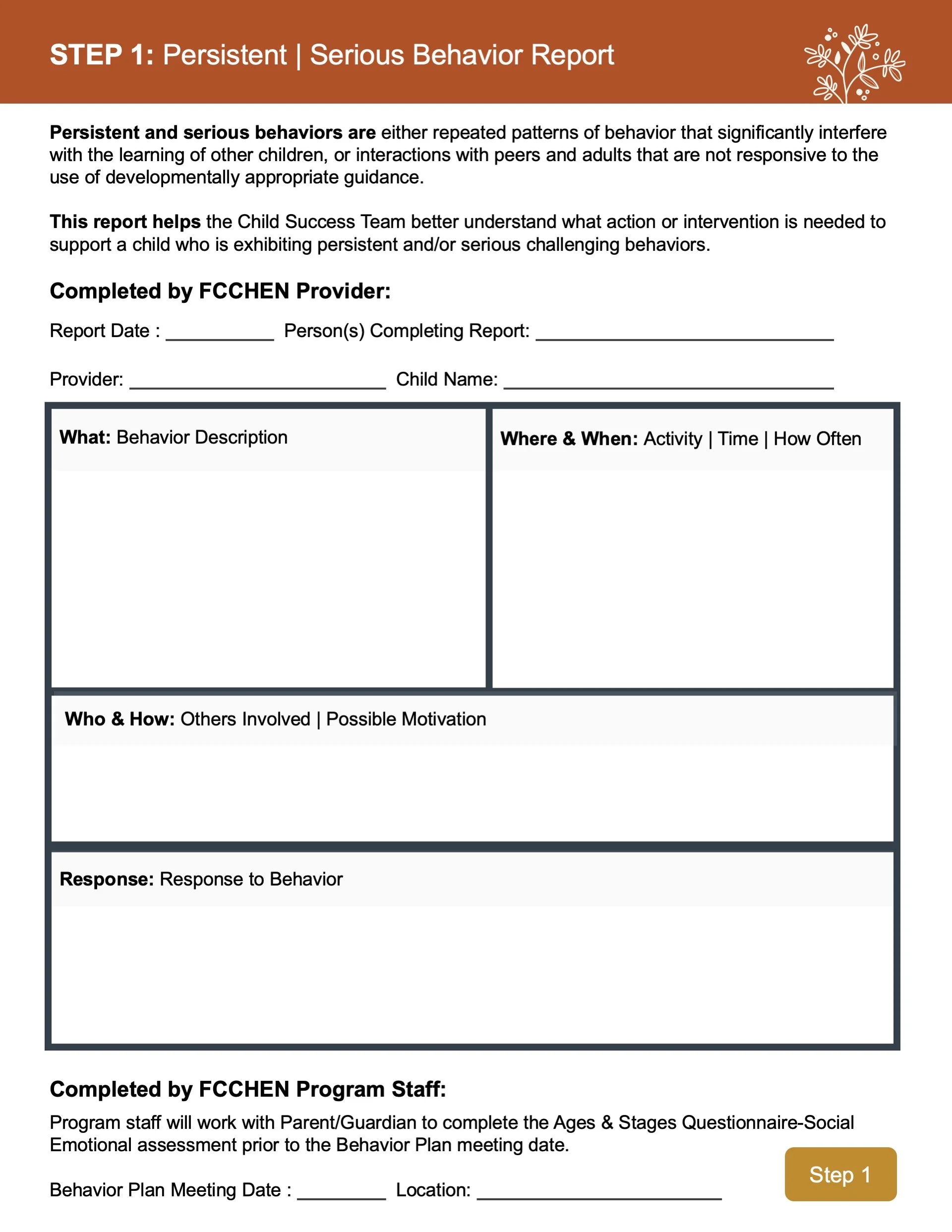 Document the behavior on a persistent, serious behavior report. Submit the report to FCCHEN Program Staff. The report should include: