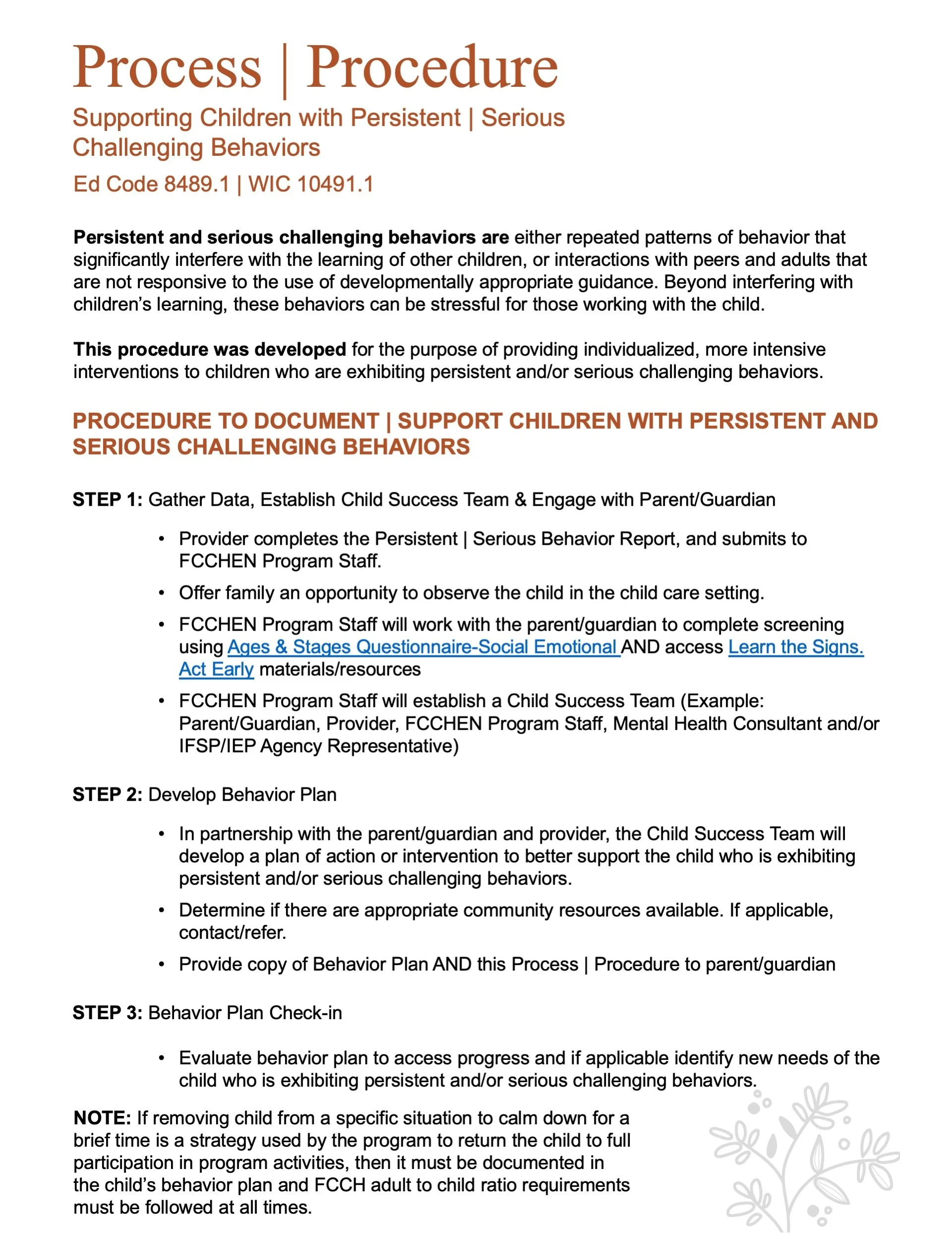 STEP 1: Complete the Supporting Children with Persistent | Serious Challenging Behaviors Procedure that includes: