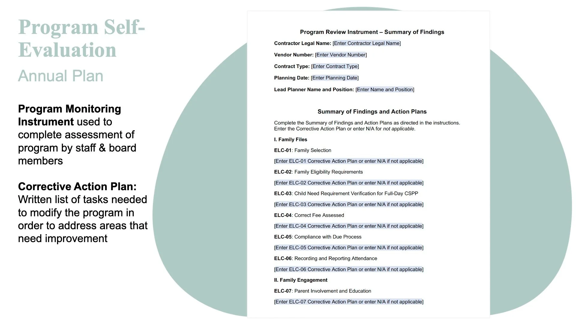 Based on the findings, a corrective action plan or written list of tasks needed to modify the program in order to address all areas that need improvement is documented on the Program Review Instrument Summary of Findings & Action Plans form.